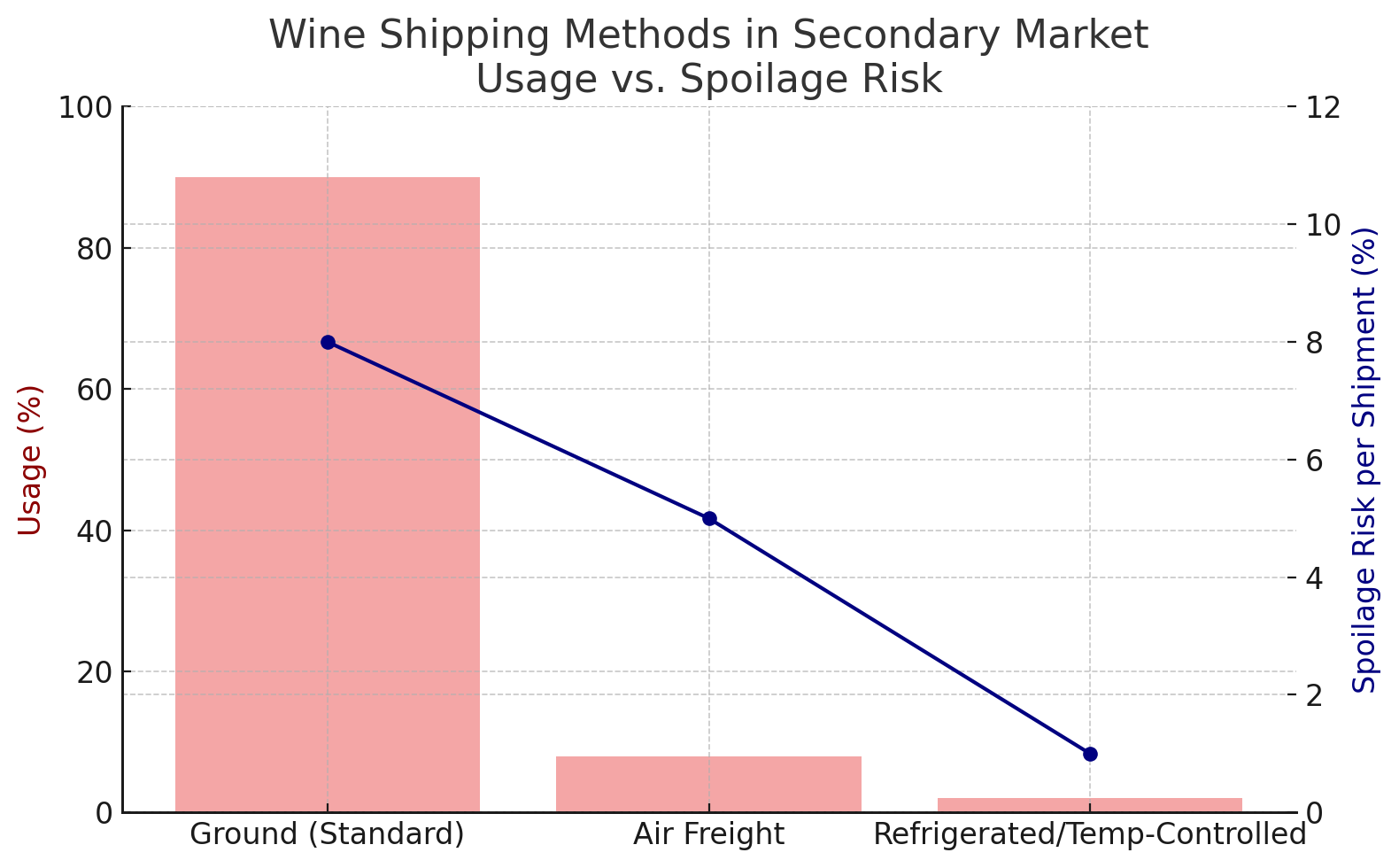 In short, every shipment is a roll of the dice. Even with good packaging and handling, there is some probability that the wine’s quality will be compromised by the journey. Let's take a look at how most wines are shipped: Ground shipping (~90% of shipments) dominates but carries the highest spoilage risk; air freight (~8%) is faster but still introduces vibration and oxidation stresses; refrigerated or temperature-controlled shipping (~2%) is rare but best for preserving quality. This chart tells the story: