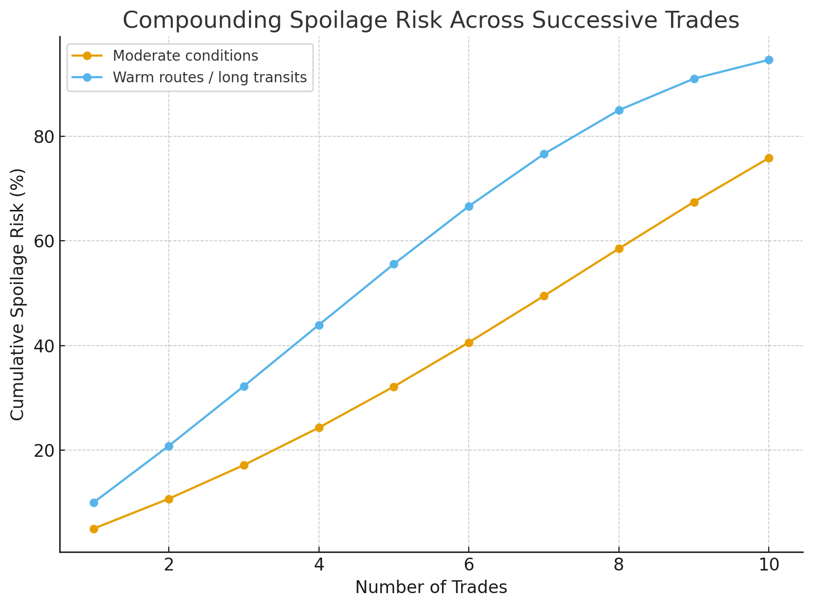 In the first scenario, we'll consider moderate conditions, with a baseline risk ~5% per shipment, growing 20% per trade, capped at 30%. In the second, we'll consider warm routes and longer transits, with baseline risk ~10% per shipment, growing 20% per trade, capped at 40%. These are reasonable assumptions given the data (see references below).